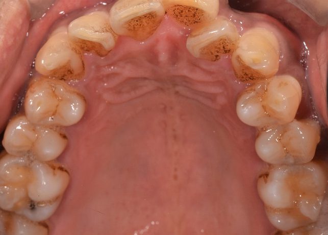 歯科治療を長期間受けたことがないこと、歯列不正があること、長年に渡る喫煙歴やコーヒーを毎日飲む習慣があることから、レントゲン撮影に加えて口腔内写真を撮影させていただきました。