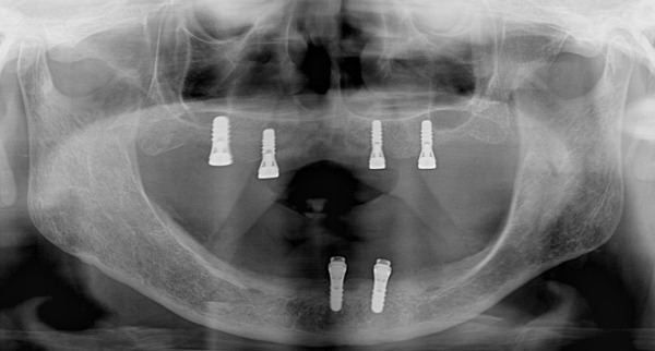 初診でレントゲン写真を見たとき正直、骨も少なく、年齢や持病など全身的なことからインプラント治療をお断りしようかと思いました。